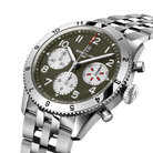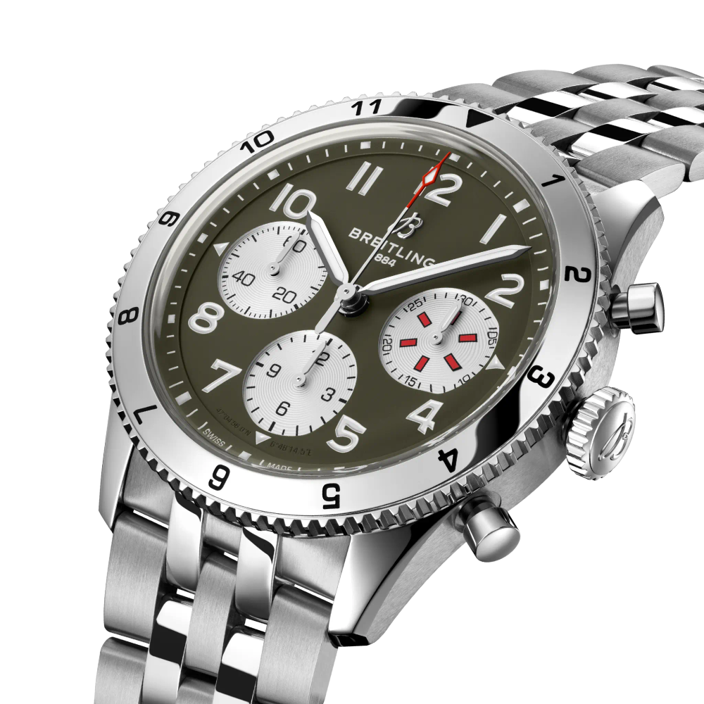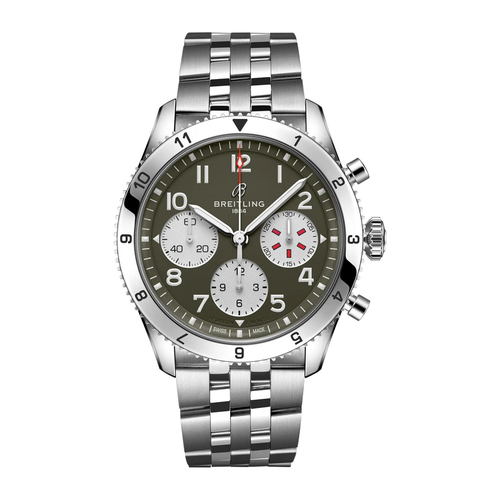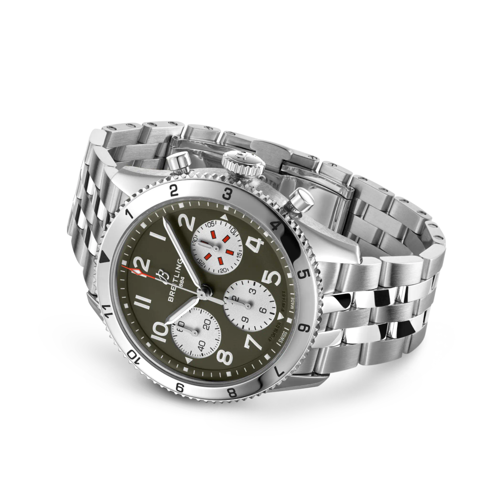 The knurled bezel on the 42mm case provides optimal grip, even in a pilot’s gloved hands. Top-stitched calfskin straps give a nod to the seams found on classic flight gear, while the stainless-steel bracelet provides an elegant alternative. Pilots and other travelers will appreciate its legibility, wearability, and understated style. The engine of the Classic AVI is the COSC-certified Breitling Caliber 23 movement, which provides approximately 48-hours of power reserve.