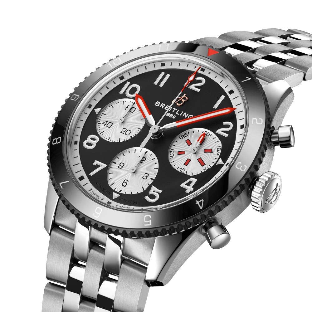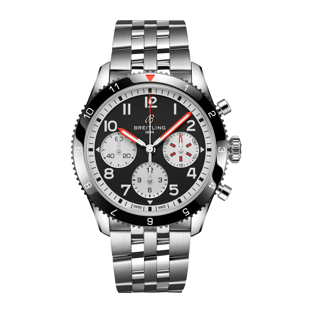 The knurled bezel on the 42mm case provides optimal grip, even in a pilot’s gloved hands. Top-stitched calfskin straps give a nod to the seams found on classic flight gear, while the stainless-steel bracelet provides an elegant alternative. Pilots and other travelers will appreciate its legibility, wearability, and understated style. The engine of the Classic AVI is the COSC-certified Breitling Caliber 23 movement, which provides approximately 48-hours of power reserve.