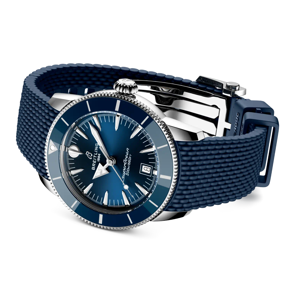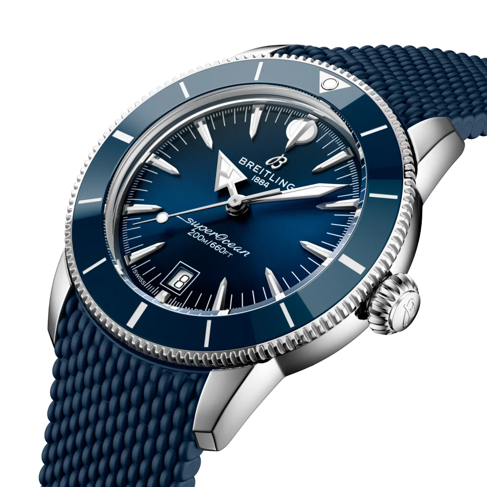 The latest Superocean Heritage builds on everything that made the original distinctive—and sharpens it. The collection introduces the B31 automatic movement, Breitling’s first exclusive three-hand manufacture caliber. A ceramic-inlayed bezel adds exceptional scratch resistance, while integrated mesh-metal or mesh-rubber bracelets fit snugly against the case, secured with folding clasps for a clean, watertight finish. A discreet date window at six o’clock and the original signature hands—arrow for hours, spear for minutes—ensure legibility and balance, above or below the surface.