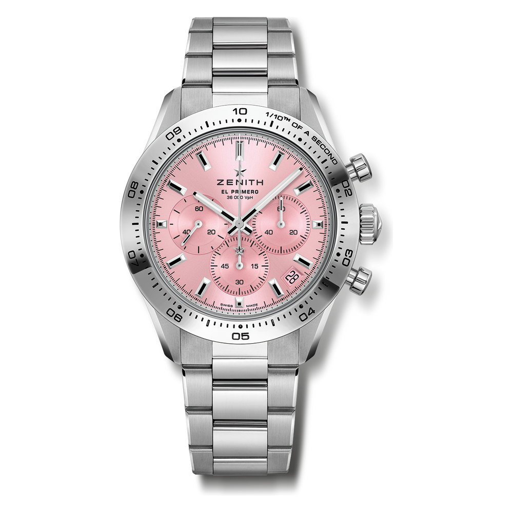 The CHRONOMASTER Sport Pink is crafted in a 41mmmm steel case with a polished steel bezel, paired with a metallic pink dial and a steel bracelet. Powered by the El Primero 3600 automatic high-frequency chronograph movement with 1/10th of a second chronograph function and a power reserve of 60 hours. Limited edition of 500 pieces, with proceeds from the sale benefitting the Susan G. Komen® foundation.