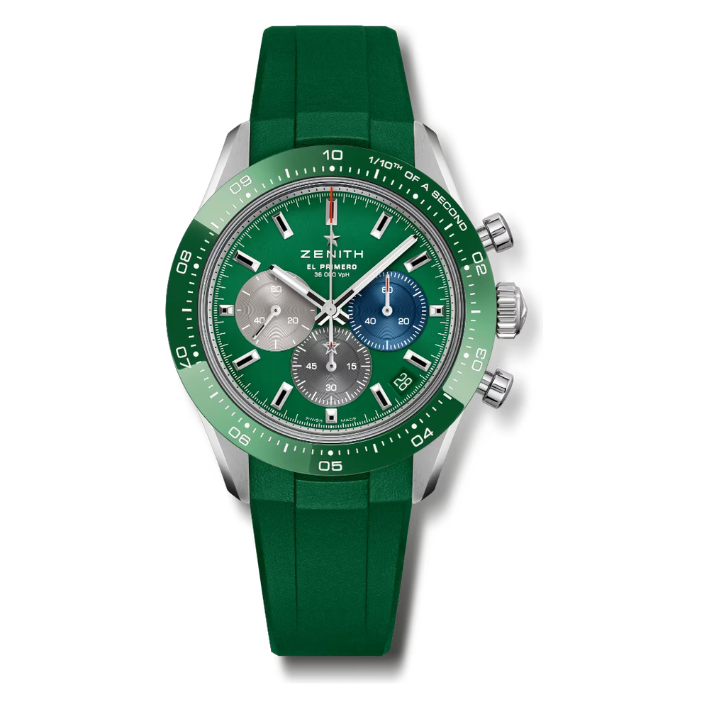 The CHRONOMASTER Sport is crafted in a 41mm steel case with a green ceramic bezel, paired with a lacquered green tricolour dial and a green rubber strap. Powered by the El Primero 3600 automatic high-frequency chronograph movement with 1/10th of a second chronograph function and a power reserve of 60 hours.