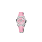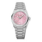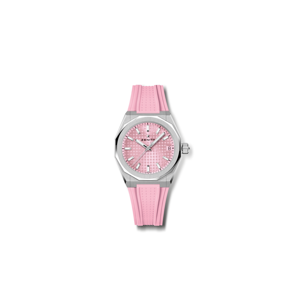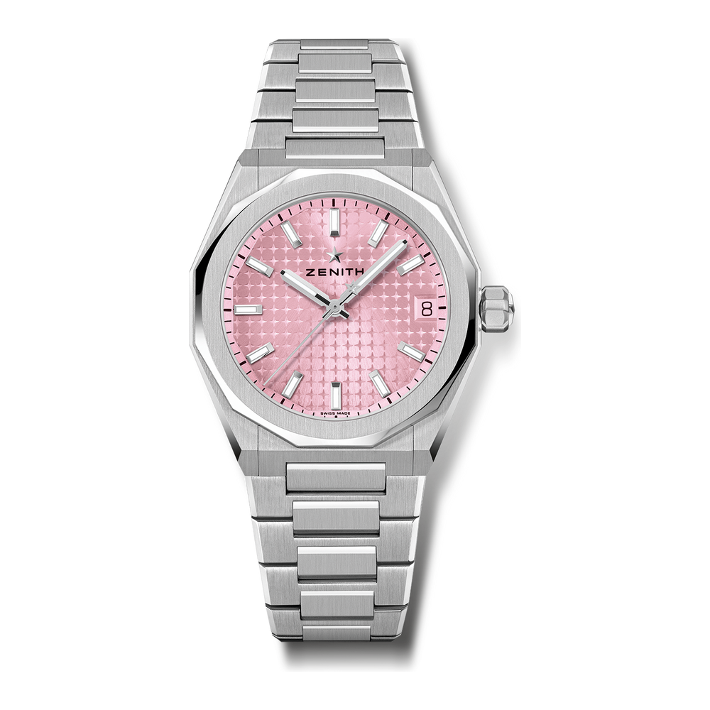 DEFY Skyline in a 36mm steel octagonal case with a faceted bezel, featuring a metallic pastel pink sunburst-patterned dial revisiting the emblematic ZENITH four-pointed star. Powered by the Elite 670 automatic manufacture movement. Delivered with a steel bracelet, a second pink patterned rubber strap is included, to fully experience the interchangeability.
