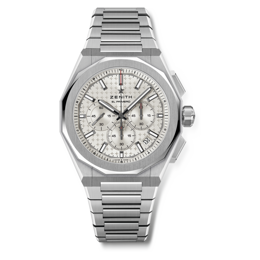 DEFY Skyline Chronograph in a 42mm steel octagonal case with a faceted bezel, featuring a silver sunburst-patterned dial revisiting the emblematic ZENITH four-pointed star. Powered by the El Primero 3600 high-frequency automatic manufacture movement with the very first 1/10th of a second indicator. Interchangeable steel bracelet and green patterned rubber strap.
