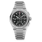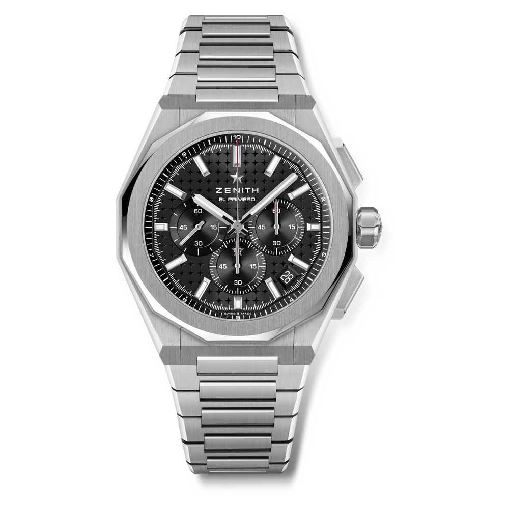 DEFY Skyline Chronograph in a 42mm steel octagonal case with a faceted bezel, featuring a black matte-patterned dial revisiting the emblematic ZENITH four-pointed star. Powered by the El Primero 3600 high-frequency automatic manufacture movement with the very first 1/10th of a second indicator. Interchangeable steel bracelet and black patterned rubber strap.