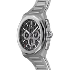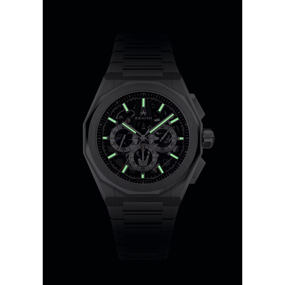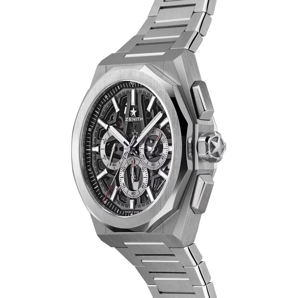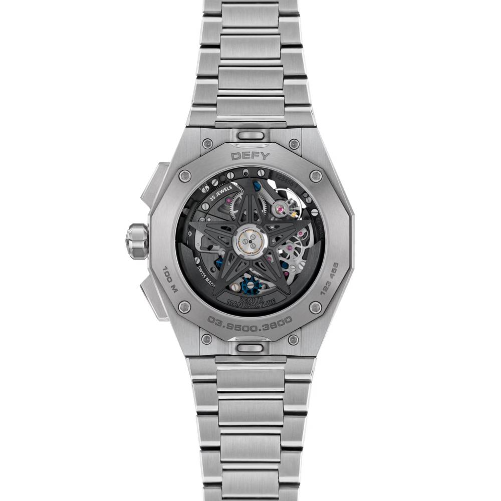 The DEFY Skyline Chronograph Skeleton in a 42mm steel octagonal case with a faceted bezel, featuring a black open dial with contrasting silver-colour subdials. Powered by the skeleton El Primero 3600SK manufacture movement, a high-frequency automatic chronograph with the very first 1/10th of a second indicator. Delivered with both a steel bracelet and a black patterned rubber strap that can easily be swapped thanks to our clever strap changing system.