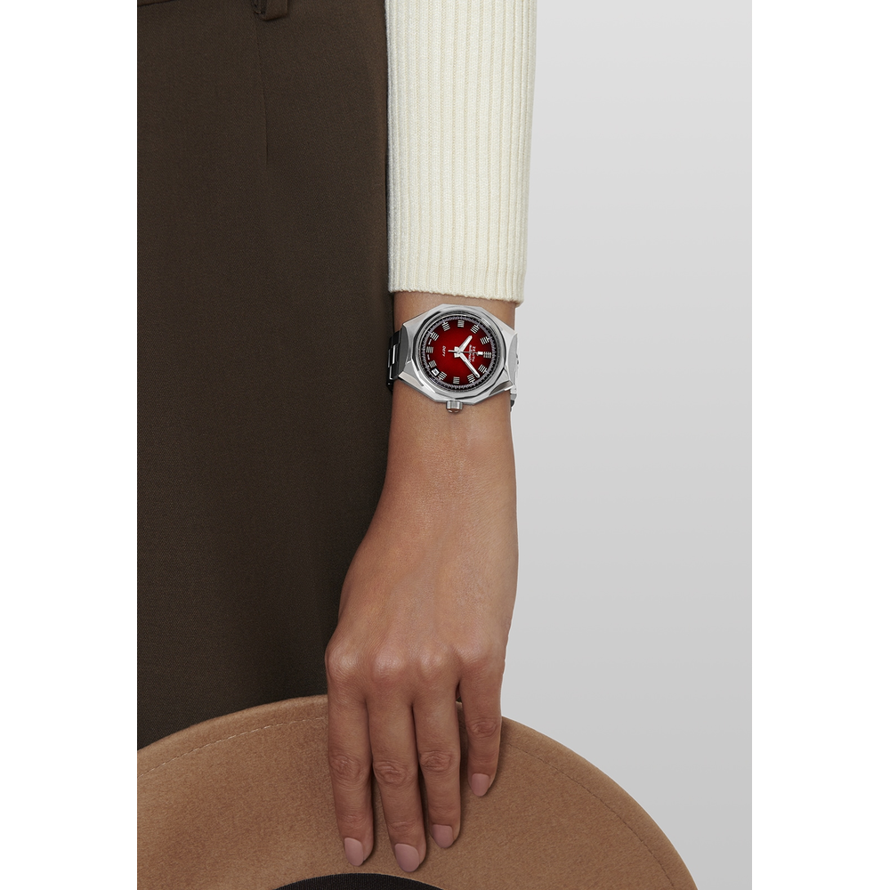 A faithful reproduction of one of the first DEFY wristwatch with a coloured dial. Crafted in a robust octagonal stainless steel case with 14-sided bezel and paired with a deep red gradient-effect dial and steel ladder bracelet. Powered by the ELITE 670 automatic manufacture movement.