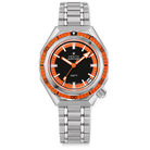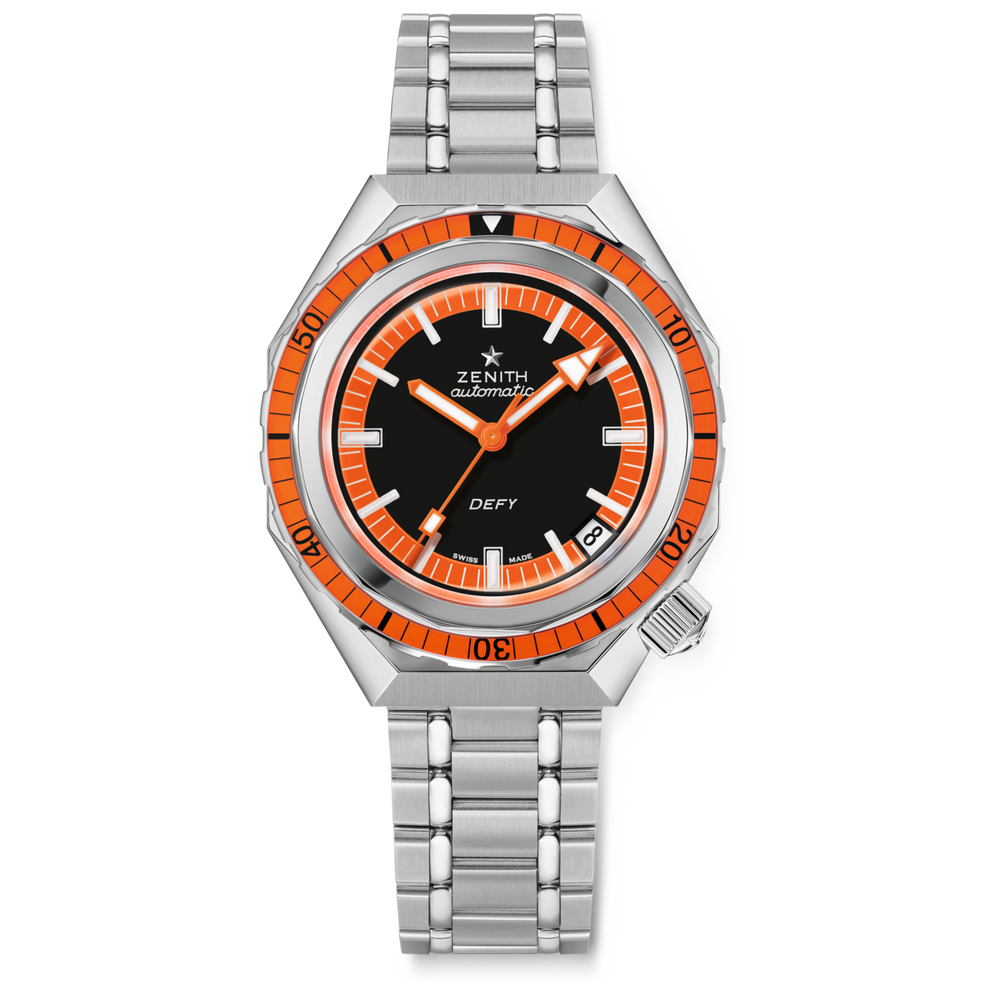 A faithful reproduction of the first DEFY diver’s watch from 1969. The DEFY Revival A3648 is crafted in a faceted 37mm steel case with a unidirectional rotating bezel in steel with orange tinted sapphire insert, with a water-resistance of 60 ATM (600 metres). Black and orange dial with luminescent hands and markers. Powered by the Elite 670 automatic manufacture movement with 50 hours power reserve. Steel bracelet with folding clasp.