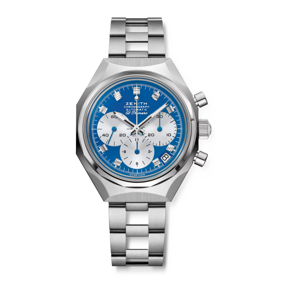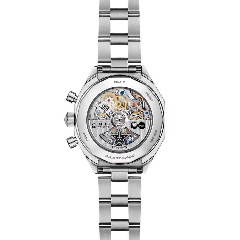 This piece of ‘imagined heritage’ takes inspiration by one of earliest DEFY wristwatches but it is powered by the iconic automatic El Primero column-wheel chronograph movement. It also echoes design cues from another icon of the same era, the USM Haller system. Crafted in a robust octagonal stainless steel case with 14-sided bezel paired with a striking USM Gentian Blue dial. Equipped with a steel ladder bracelet.