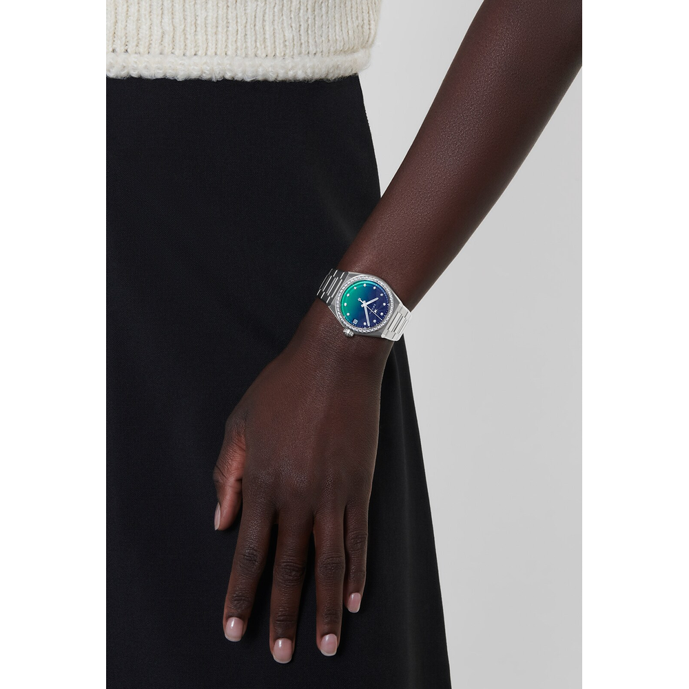 The DEFY Midnight Borealis is crafted in a 36mm steel case with a diamond-set bezel, featuring a guilloché engraved dial with a vertical colour gradient shifting from blue to green. The DEFY Midnight women's watch comes with a steel bracelet with multiple straps than can easily be swapped without requiring any tools. Powered by the ELITE automatic manufacture calibre.