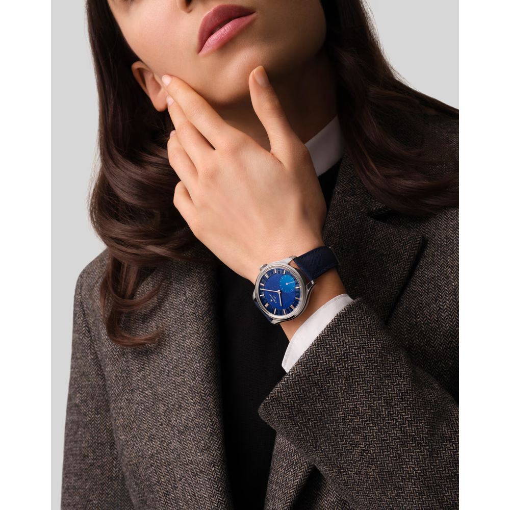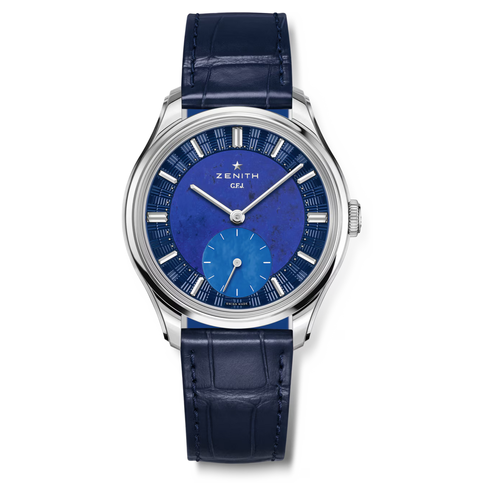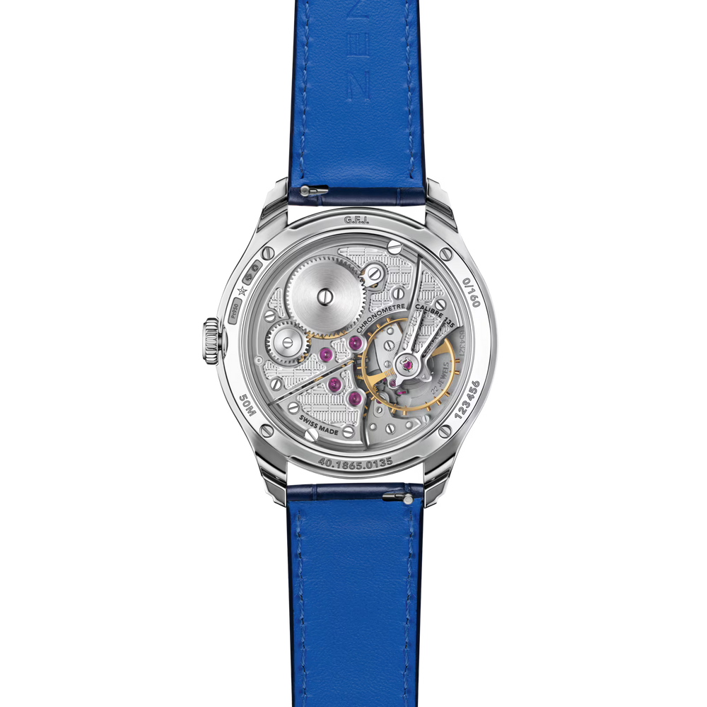 caliber 135, the most awarded movement from the golden age of observatory chronometer competitions, reengineered to integrate subtle yet meaningful improvements that enhance its reliability, precision, and overall performance without compromising its essence. Its slender 39mm platinum round case features a stepped bezel and curved stepped lugs. Its 3-part blue dial combines a brick guilloche pattern, lapis lazuli and mother-of-pearl. Delivered with 3 different straps: a dark blue alligator leather strap, a black calfskin leather strap and a blue “Saffiano” calfskin leather strap