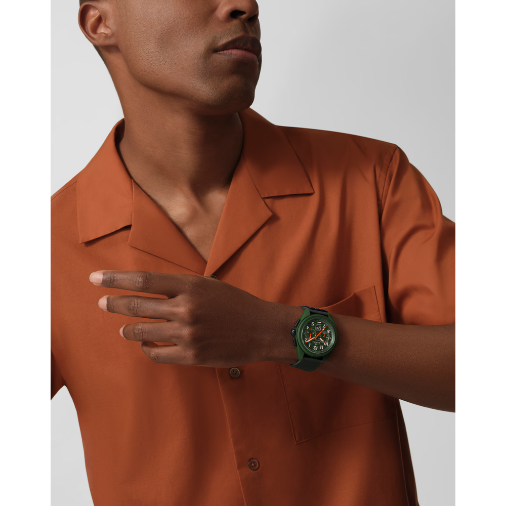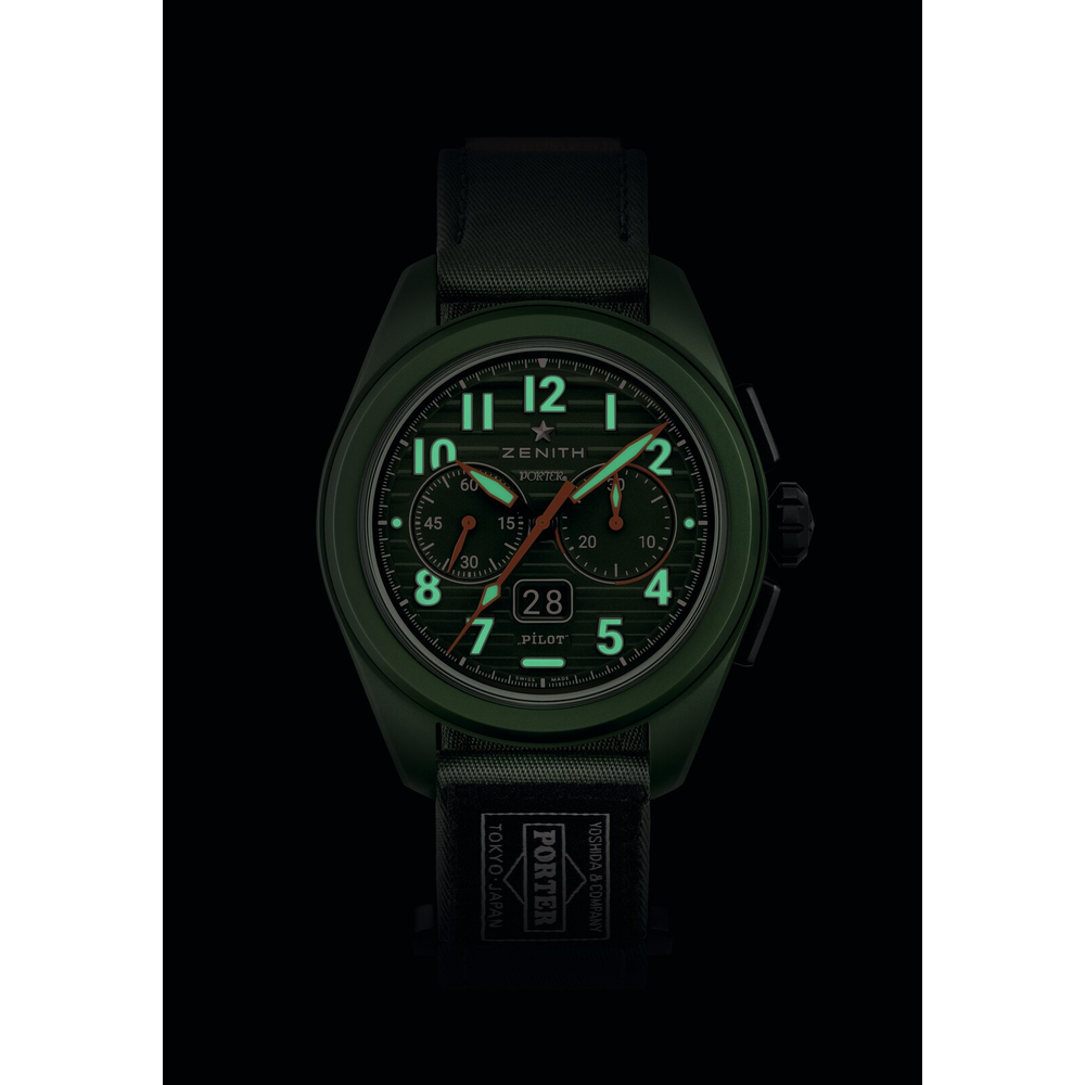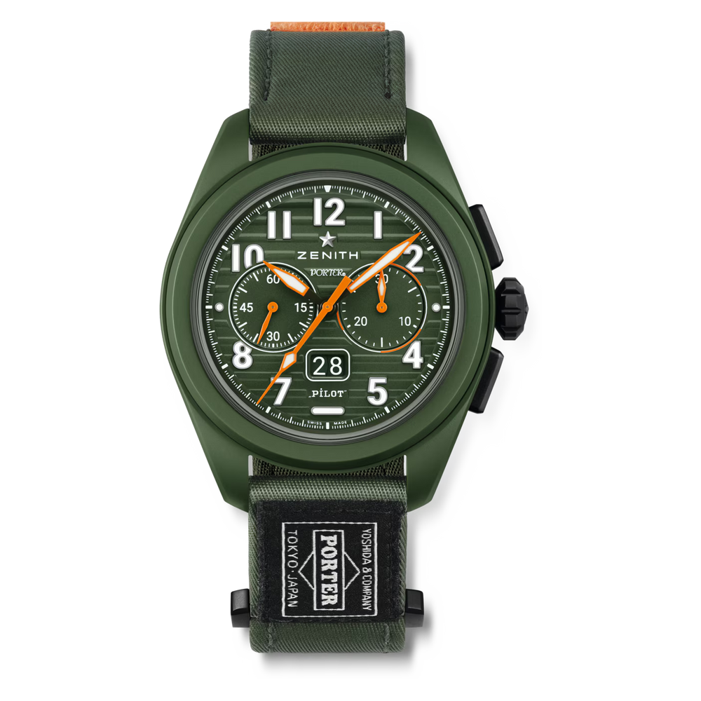 The PILOT Big Date Flyback Porter limited edition is crafted in a 42.5mm khaki-green ceramic case with an oversized crown, paired with a khaki-green corrugated dial featuring large luminescent Arabic numerals. Powered by the El Primero 3652 automatic high-frequency chronograph caliber with big date and flyback functions.Completing the look, the PILOT