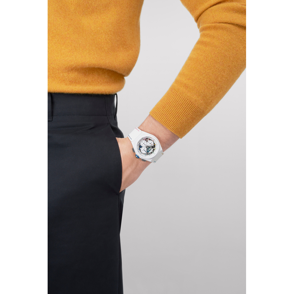 The DEFY 21 Chroma II is a colourful execution of the high-frequency El Primero 21 1/100th of a second chronograph model, crafted in a 44mm matte white ceramic case with rainbow-coloured movement visible through the open dial set with markers in a gradient of tones. The white rubber strap also features rainbow stitching.