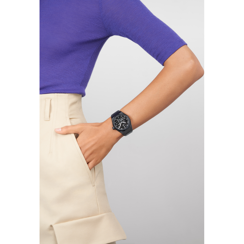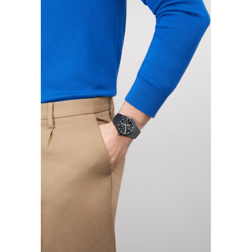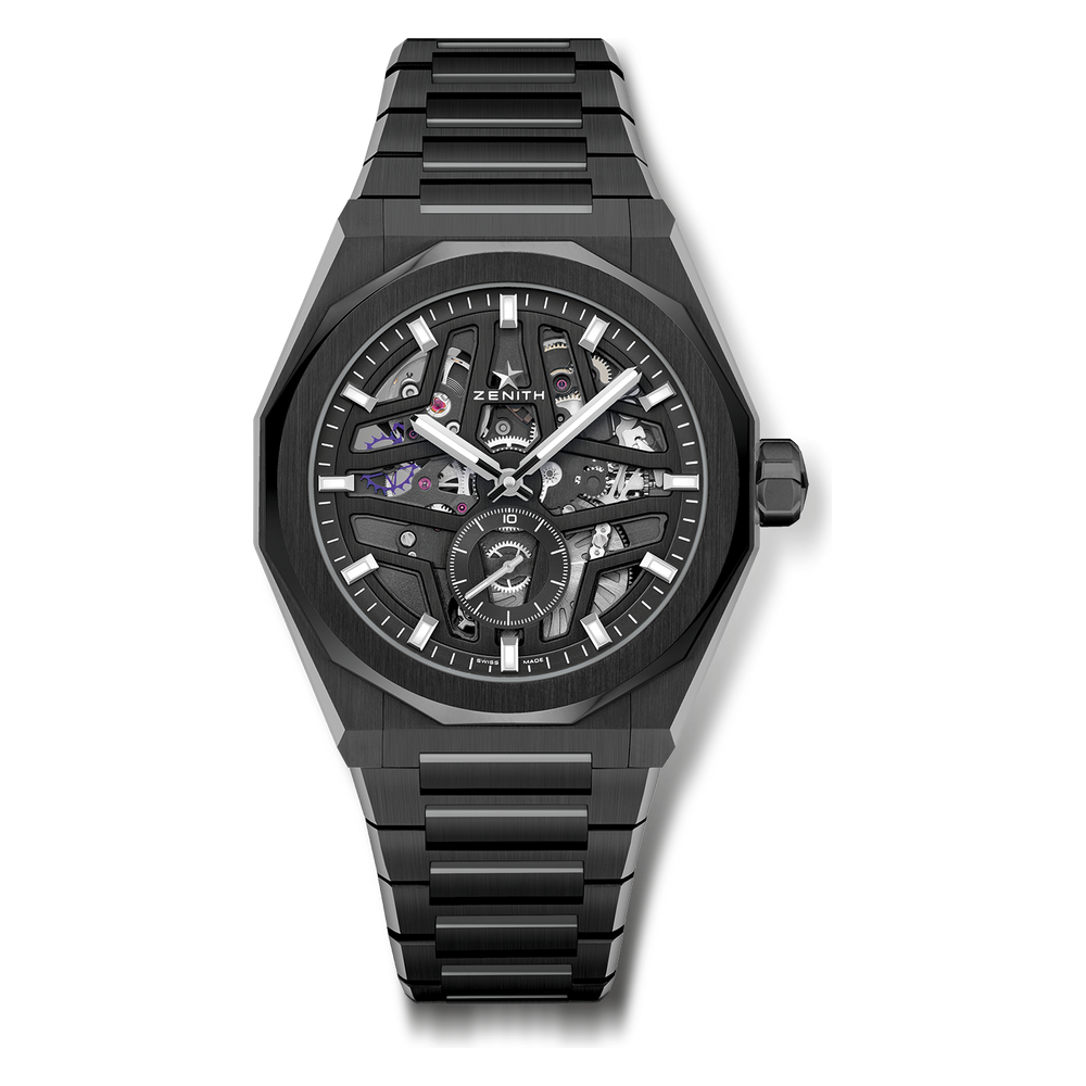 DEFY Skyline Skeleton in a 41mm black ceramic octagonal case with a faceted bezel, featuring a black open dial revisiting the emblematic ZENITH four-pointed star. Powered by the El Primero 3620 SK high-frequency automatic manufacture skeleton movement with the very first 1/10th of a second indicator. Delivered with a ceramic bracelet, a second black patterned rubber strap is included, to fully experience the interchangeability.