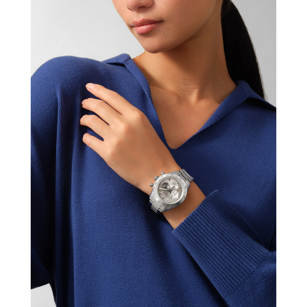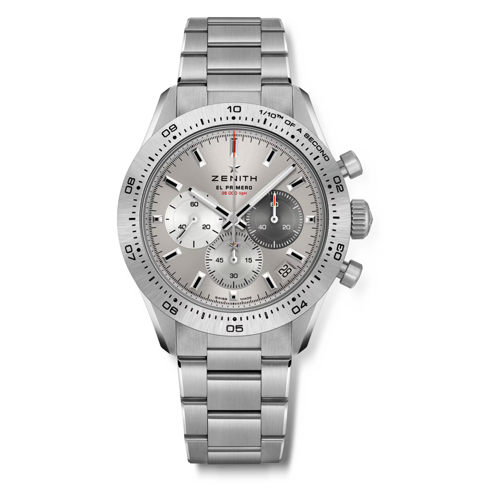 The CHRONOMASTER Sport is crafted in a 41mm titanium case with a brushed titanium bezel, paired with a nickel-grey sunburst tricolour dial and a titanium bracelet. Powered by the El Primero 3600 automatic high-frequency chronograph movement with 1/10th of a second chronograph function and a power reserve of 60 hours.