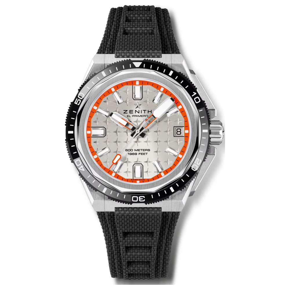 The DEFY Extreme Diver in a 42.5mm angular case is crafted in titanium, equipped with a rotating black ceramic bezel and helium escape valve with a water-resistance of 60 ATM (600 metres). Featuring silver star-patterned dial with luminescent markers and hands. Powered by the El Primero 3620 SC automatic movement with 60 hours power reserve. Interchangeable strap system with titanium bracelet, rubber strap and single-piece fabric strap made of recycled fishing nets.
