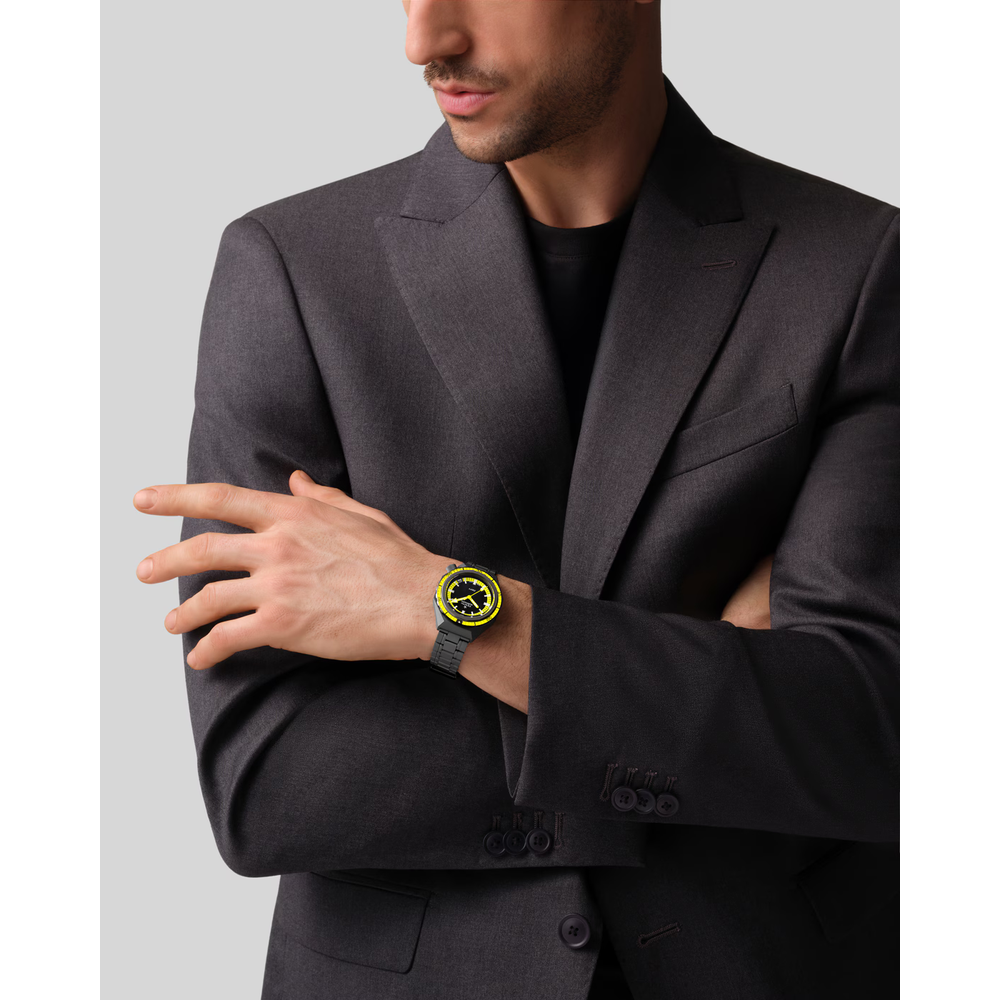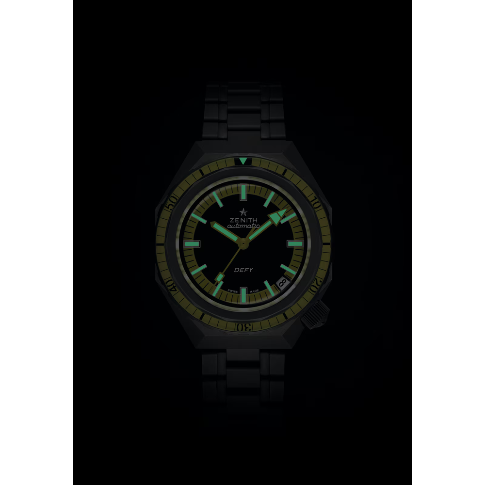 rotating bezel with a yellow tinted sapphire insert. Water-resistance of 60 ATM