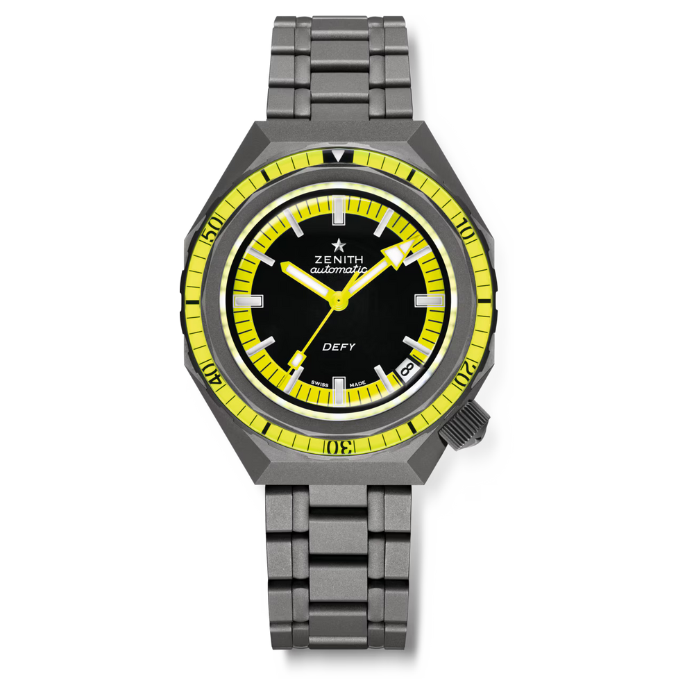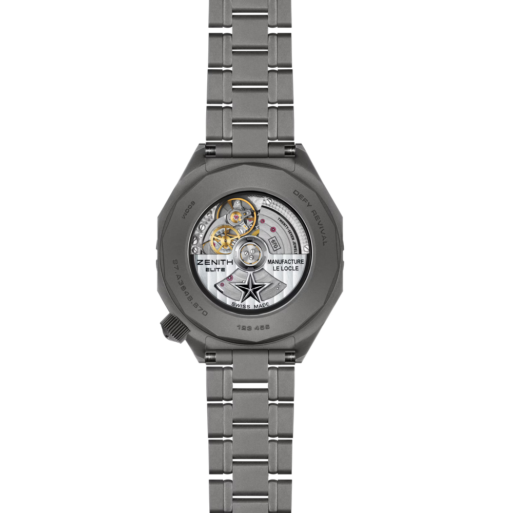 DEFY Revival is crafted in a faceted 37mm microblasted titanium case. Unidirectional
