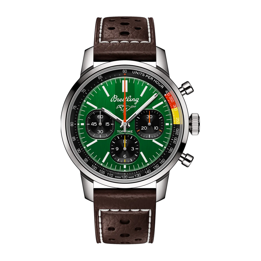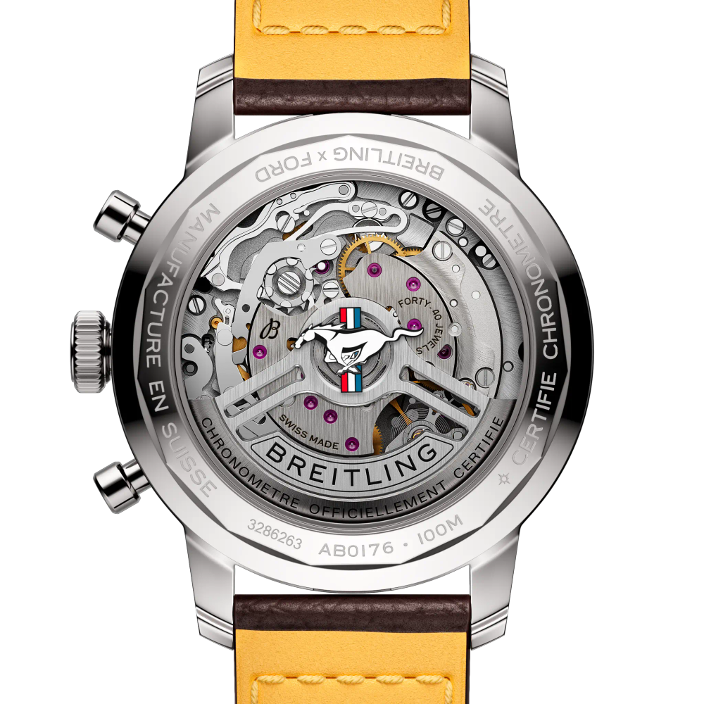 Die Top Time B01 Ford Mustang verfügt über die Farben und das Emblem ihres Oldtimer-Pendants sowie über ein perforiertes Lederarmband, eine Tachymeterskala und kontrastierende «Squircle»-Zifferblätter (nicht ganz quadratisch, nicht ganz rund), die die besondere Atmosphäre klassischer Armaturenbretter erzeugen. Zudem hat sie einen Motor unter der Haube, mit dem man sich sehen lassen kann: das aussergewöhnliche Breitling-Manufakturkaliber 01.