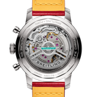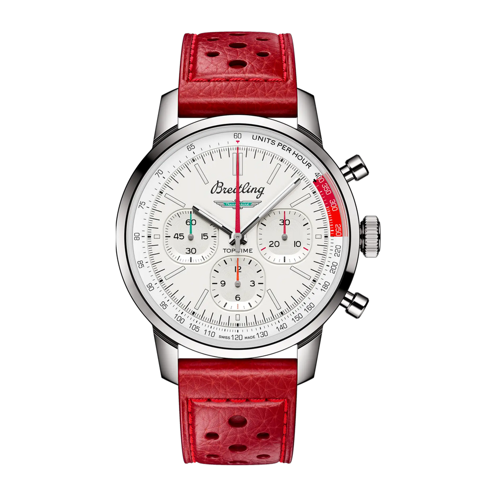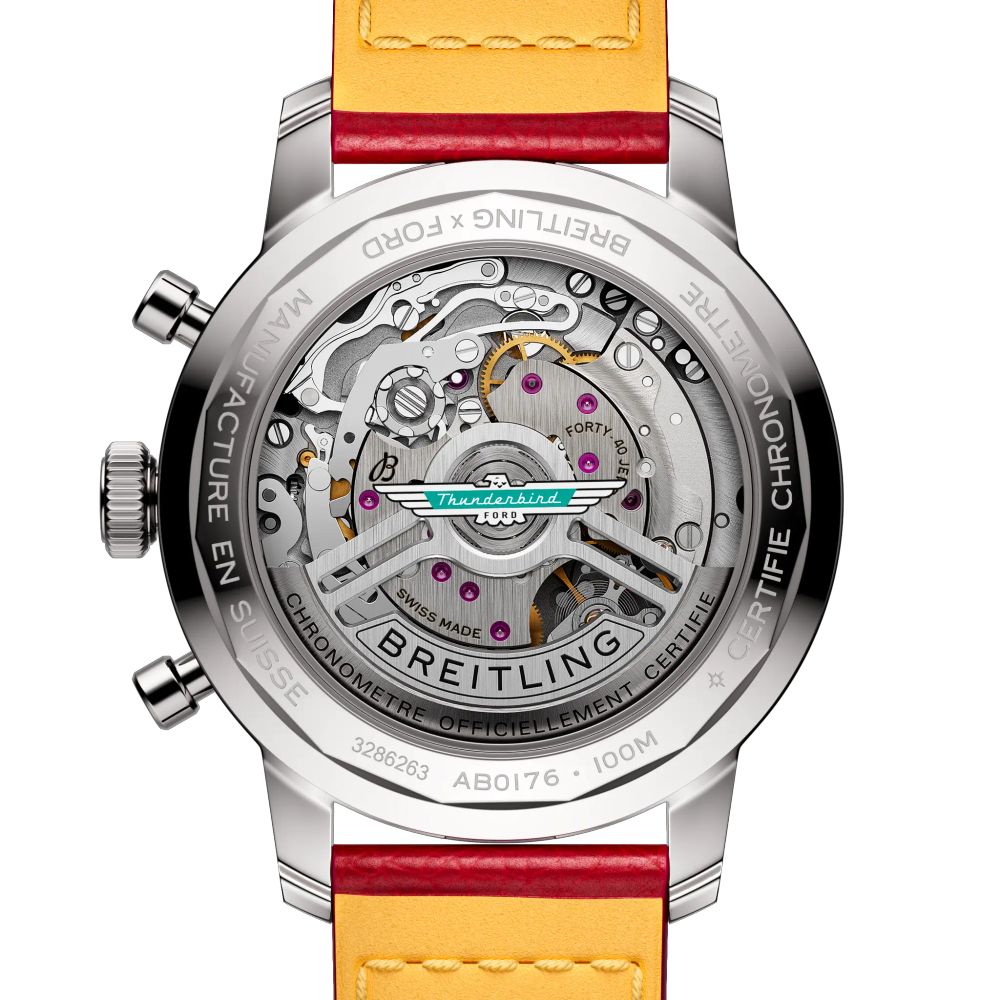 Die Top Time B01 Ford Thunderbird verfügt über die Farben und das Emblem ihres Oldtimer-Pendants sowie über ein perforiertes Lederarmband, eine Tachymeterskala und kontrastierende «Squircle»-Zifferblätter (nicht ganz quadratisch, nicht ganz rund), die die besondere Atmosphäre klassischer Armaturenbretter erzeugen. Zudem hat sie einen Motor unter der Haube, mit dem man sich sehen lassen kann: das aussergewöhnliche Breitling-Manufakturkaliber 01.