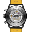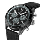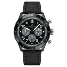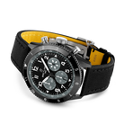 Das schwarze Keramikgehäuse bildet einen auffälligen Kontrast zu den Drückern, der Krone, dem Gehäuseboden und der Schliesse aus Titan. Die geriffelte Lünette bietet auch mit Pilotenhandschuhen optimale Griffigkeit. Das Militärlederarmband ist eine Anspielung auf die klassische Fliegerausrüstung. Piloten und andere Reisende werden die Möglichkeit schätzen, über die 24-Stunden-Markierung auf der Innenlünette und den GMT-Zeiger mit weisser Spitze eine zweite Zeitzone anzuzeigen. Angetrieben wird die Super AVI von einem COSC-zertifizierten Breitling-Manufakturkaliber B04, das eine Gangreserve von etwa 70 Stunden bietet.