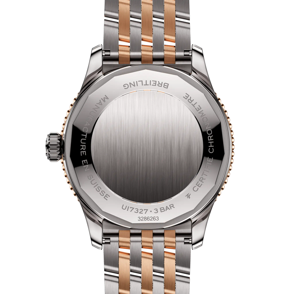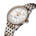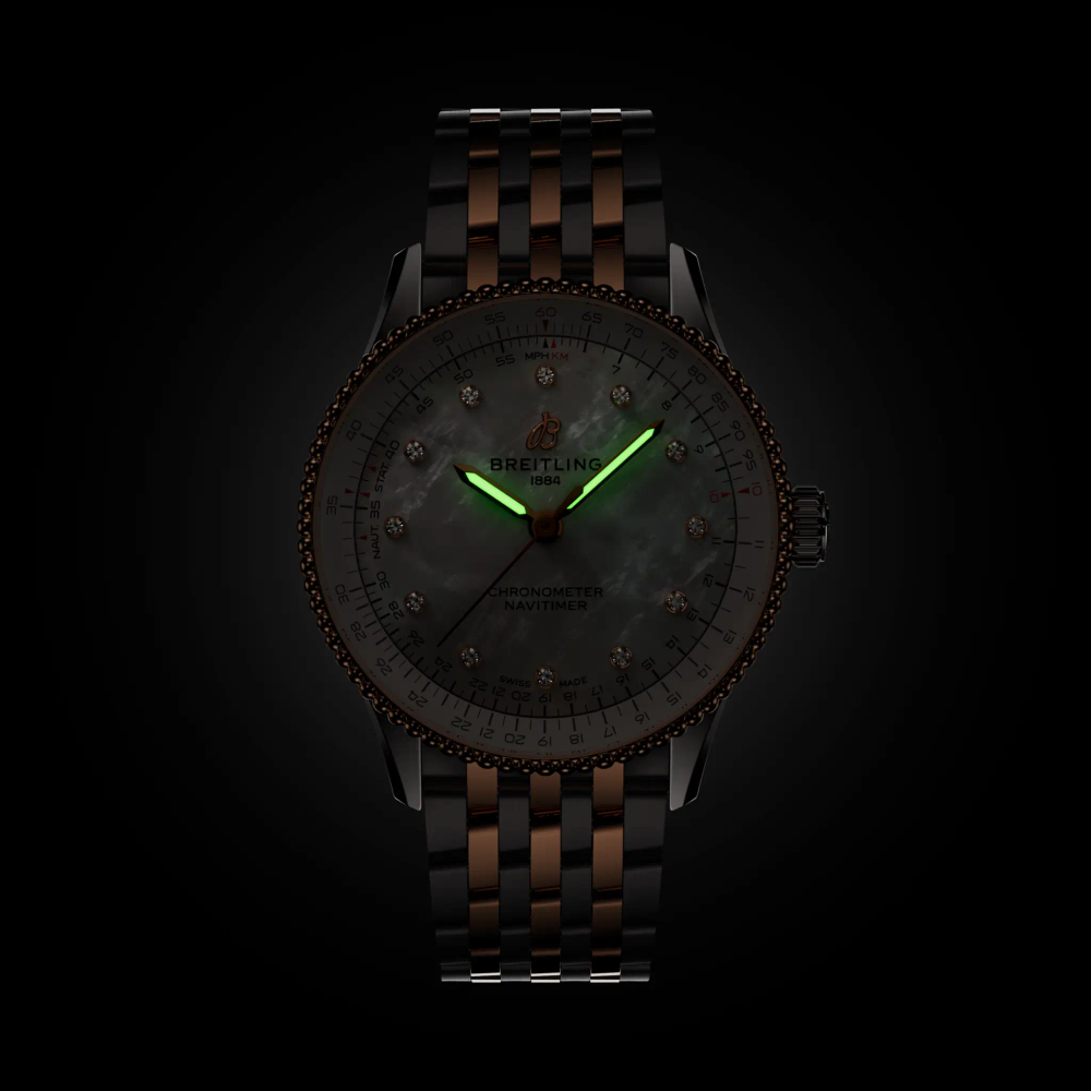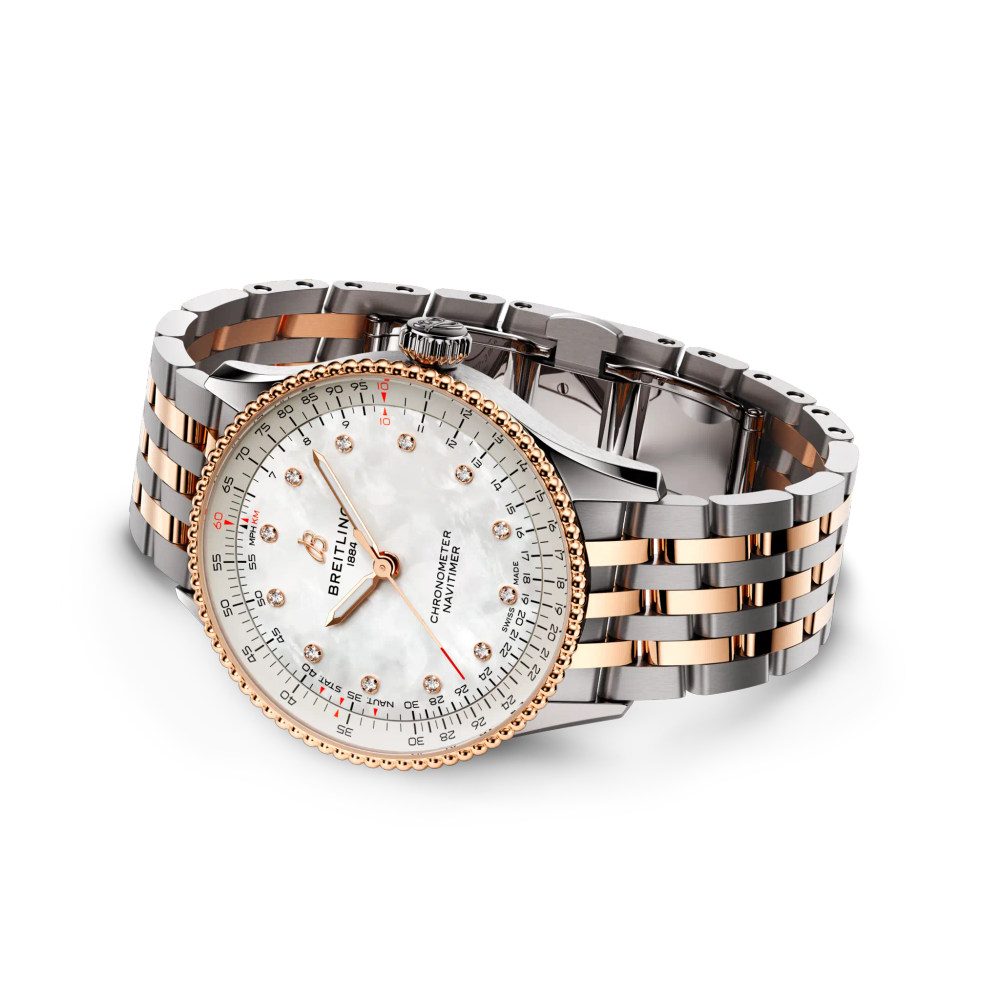 Unsere Ikone kommt jetzt in den Grössen 36 und 32 mm für Frauen und Männer, die die Optik und Haptik einer Uhr mit kleinerem Durchmesser lieben. Während die 36-mm-Navitimer die Perlenlünette und den ikonischen kreisförmigen Rechenschieber aufweist, die der Navitimer ihr unverkennbares Aussehen verleihen, verzichtet die beeindruckende 32-mm-Variante auf den Rechenschieber zugunsten eines schlichteren Zifferblattdesigns, das auf den schlanken Durchmesser abgestimmt ist.