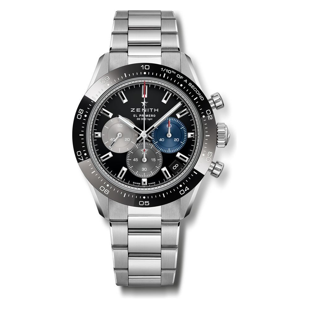 Die CHRONOMASTER Sport führt Merkmale früherer ZENITH Chronographen wie das dreifarbige Zifferblatt, die Drücker im Pumpenstil, das Edelstahlarmband und die schwarze Keramiklünette in einem modernen 41-mm-Gehäuse zusammen. Diese Version verfügt über ein schwarzes Zifferblatt und ein integriertes Edelstahlarmband. Angetrieben vom automatischen 1/10-Sekunden-Chronographenwerk El Primero 3600.