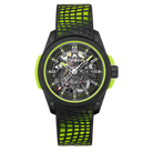 Skelettiertes schwarzes Zifferblatt mit gelbgrünen Aufdrucken