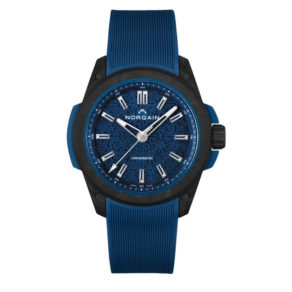 Blaues, lasergeschnittenes Zifferblatt mit drei Ebenen und einem vom NORQAIN Logo inspirierten, Mandala-ähnlichen Muster