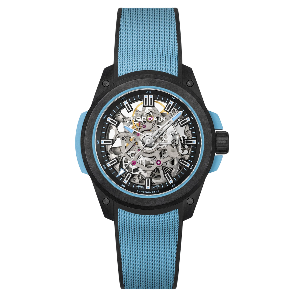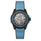 Schwarzes skelettiertes Zifferblatt mit farbigem Aufdruck in Sky Blue