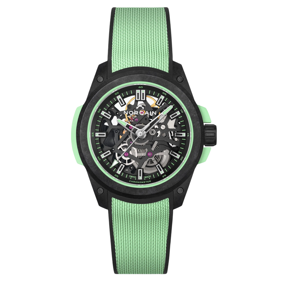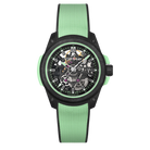 Schwarzes skelettiertes Zifferblatt mit Mint farbigem Aufdruck