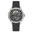 Skelettiertes anthrazitfarbenes Zifferblatt mit transparenter Hauptplatine