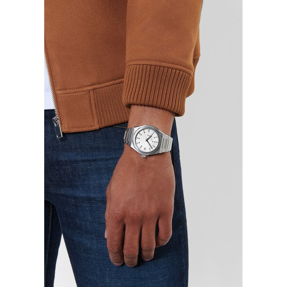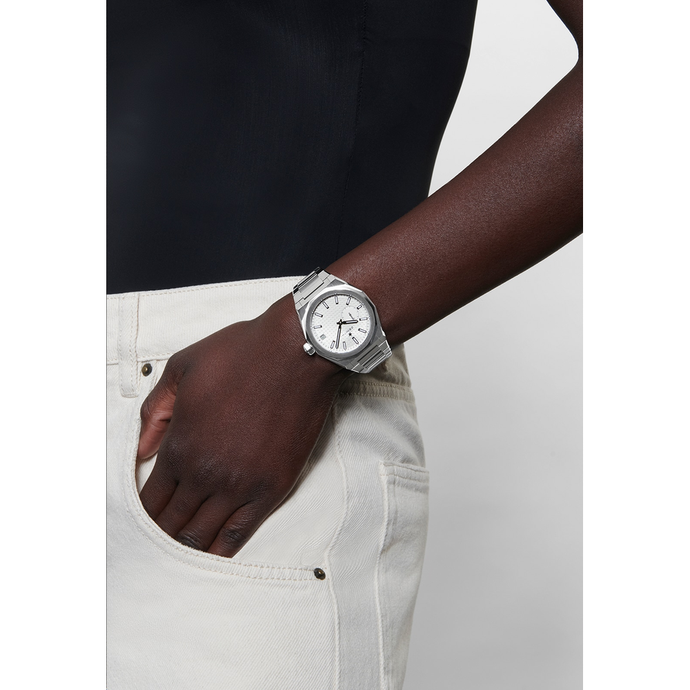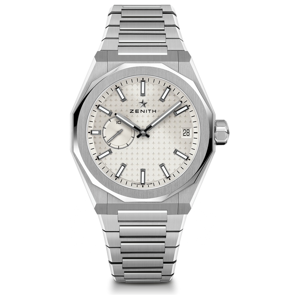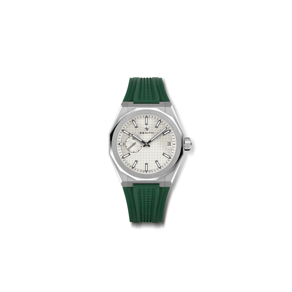 DEFY Skyline in a 41mm steel octagonal case with a faceted bezel, featuring a silver-toned sunburst-patterned dial revisiting the emblematic ZENITH four-pointed star. Powered by the El Primero 3620 high-frequency automatic manufacture movement with the very first 1/10th of a second indicator. Delivered with a steel bracelet, a second khaki green patterned rubber strap is included, to fully experience the interchangeability.