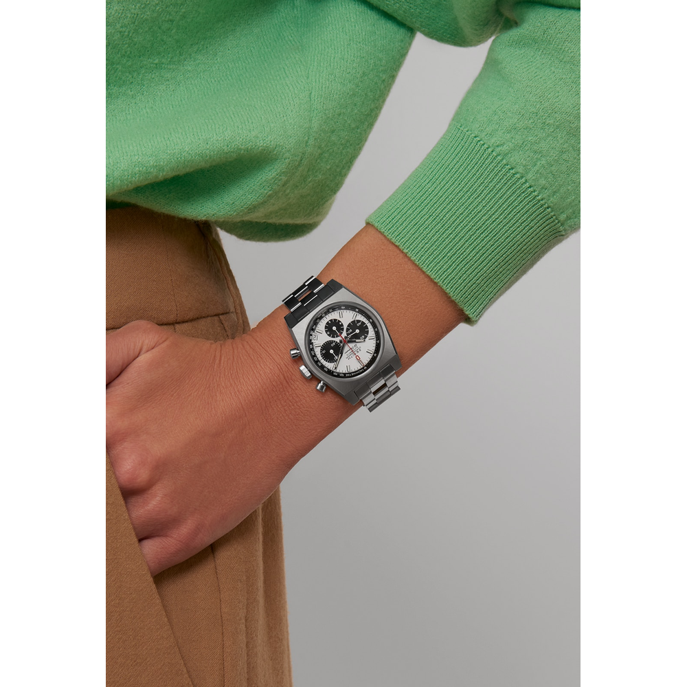 The CHRONOMASTER El Primero A384 Revival is a faithful reproduction of the very first ZENITH watch in steel to feature the El Primero high-frequency automatic chronograph calibre from 1969. The tonneau shaped case and panda dial are perfectly recreated using the original production plans. Paired with a steel ladder bracelet.