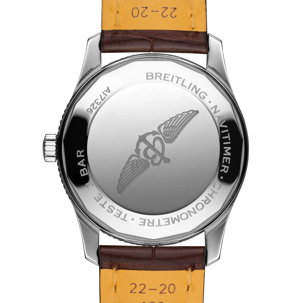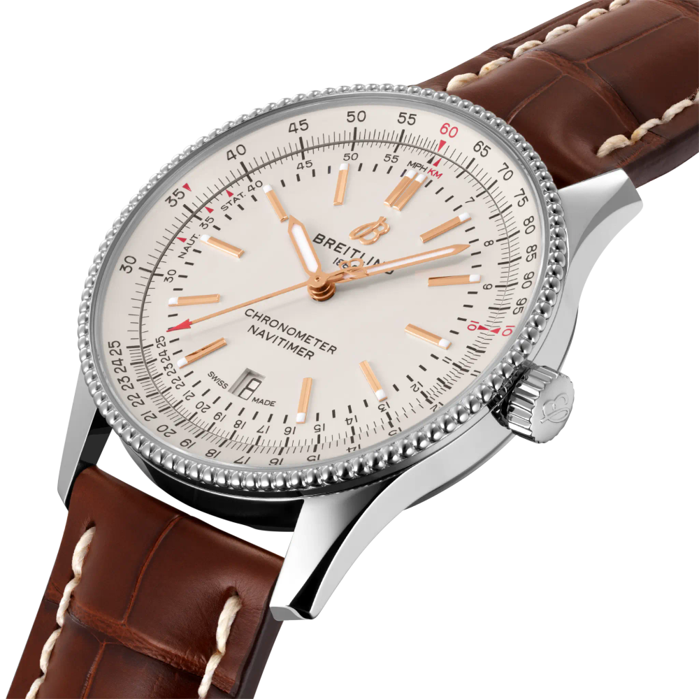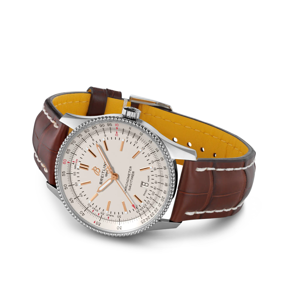 The Breitling Navitimer Automatic 41 gives a brand-new take on the Navitimer, effortlessly combining the historic appeal of a true icon with the refinement of a sophisticated, contemporary timepiece. The Navitimer Automatic 41 features a 41 mm stainless-steel case with Breitling’s famous circular slide rule and a distinctive beaded bezel. Available with an elegant black, blue or silver dial, and a choice of a stainless-steel bracelet or a matching black, blue or brown alligator strap that fits either a stainless-steel pin or folding buckle, the Navitimer Automatic 41 is powered by the Breitling Caliber 17, a COSC-certified chronometer. Compact and refined, it is an elegant reinvention of a timeless legendary watch.