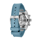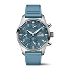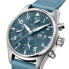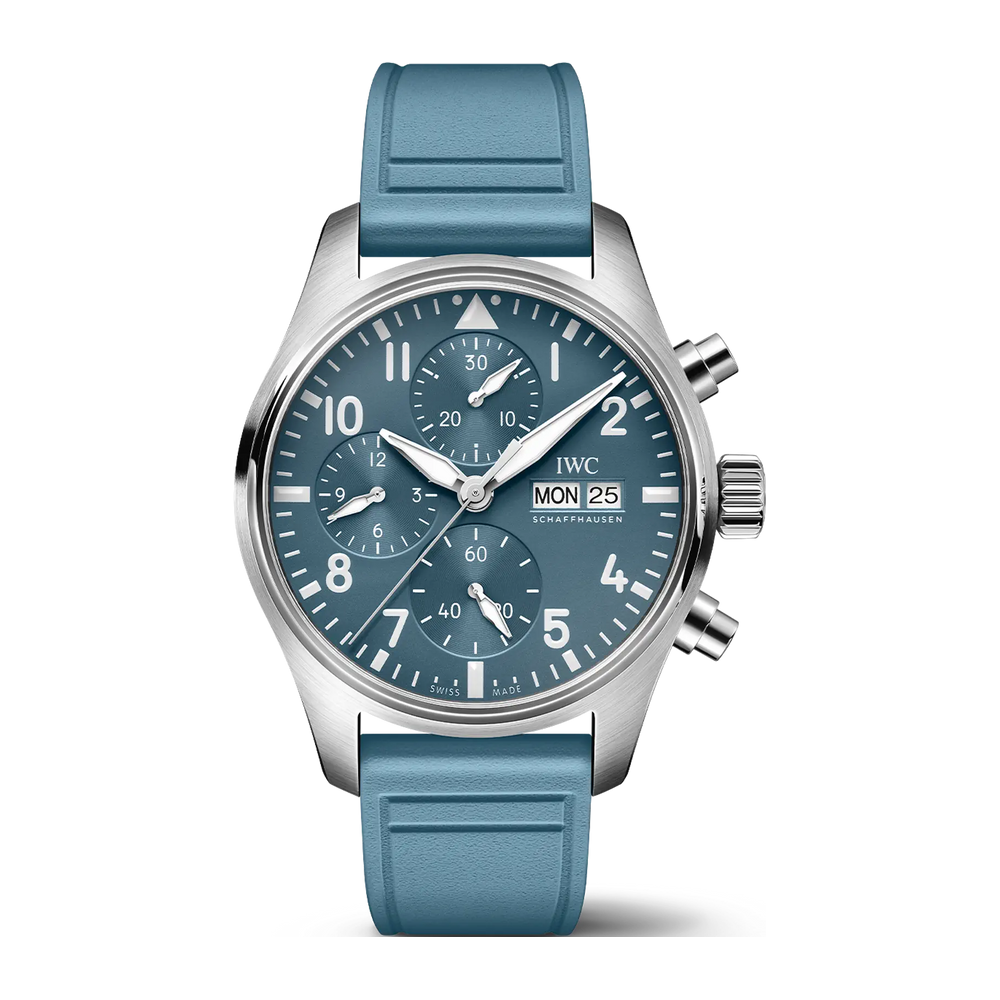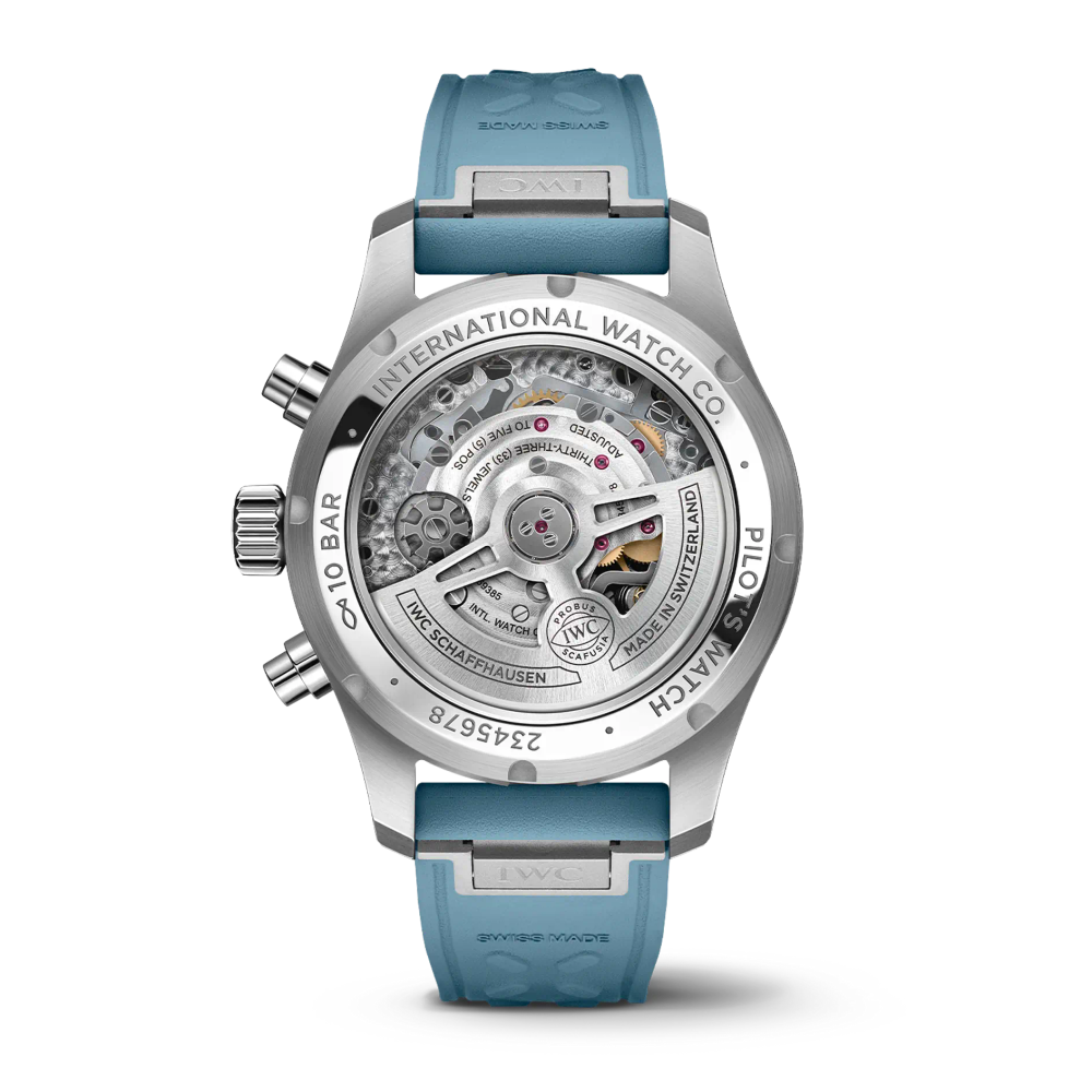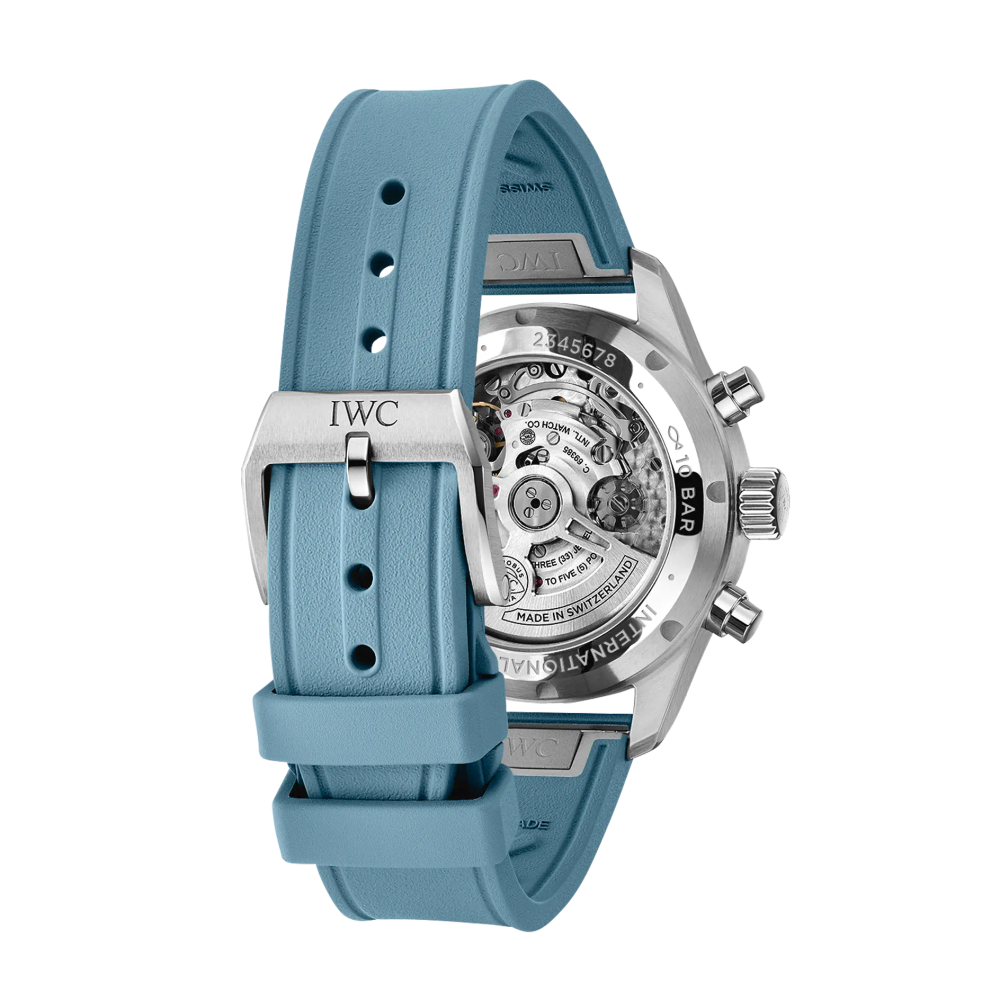 The Pilot’s Watch Chronograph 41 combines a stainless steel case with a dial and rubber strap in a color called IWC TOP GUN Miramar, a light blue shade developed by IWC Schaffhausen in collaboration with PANTONE®.