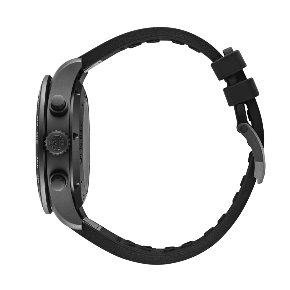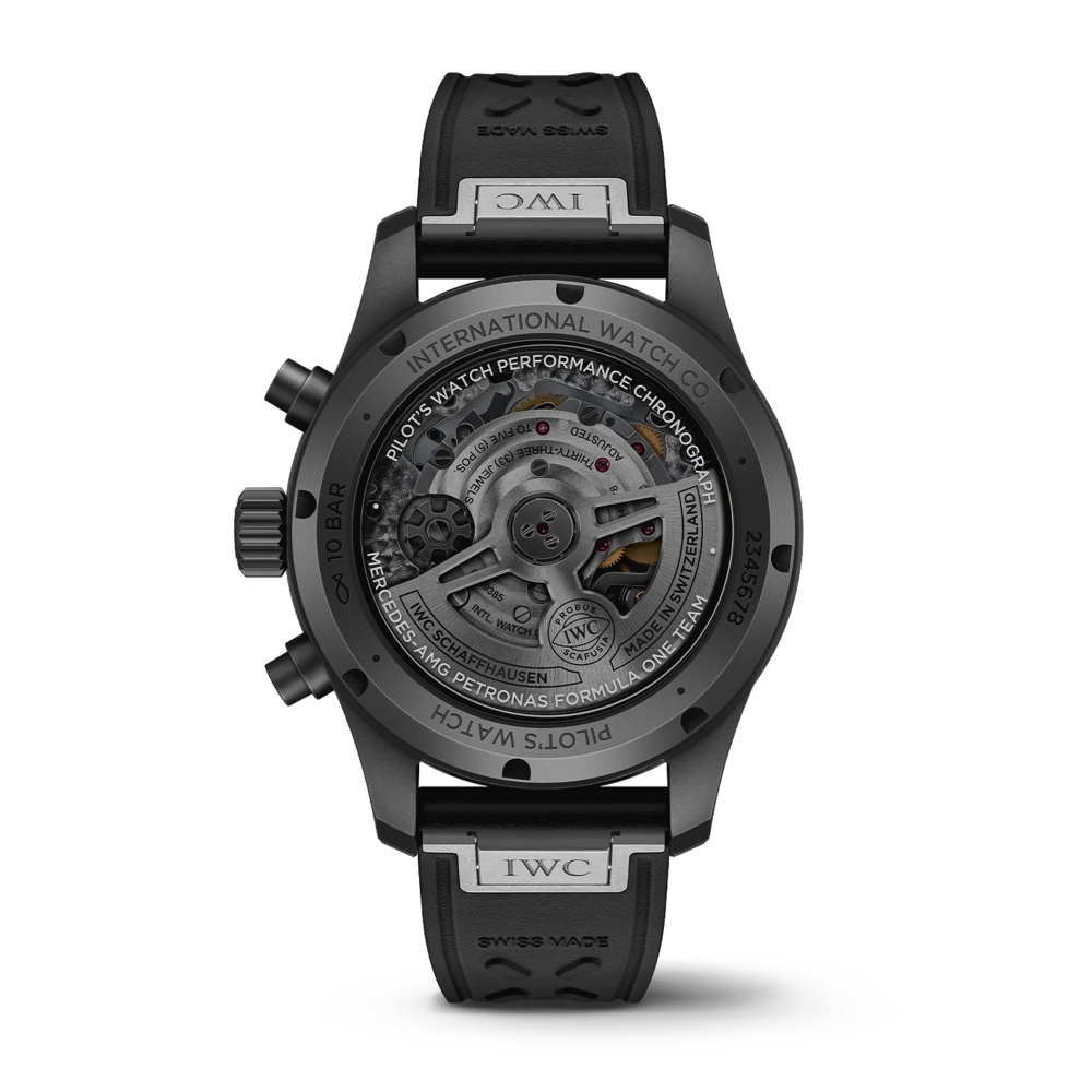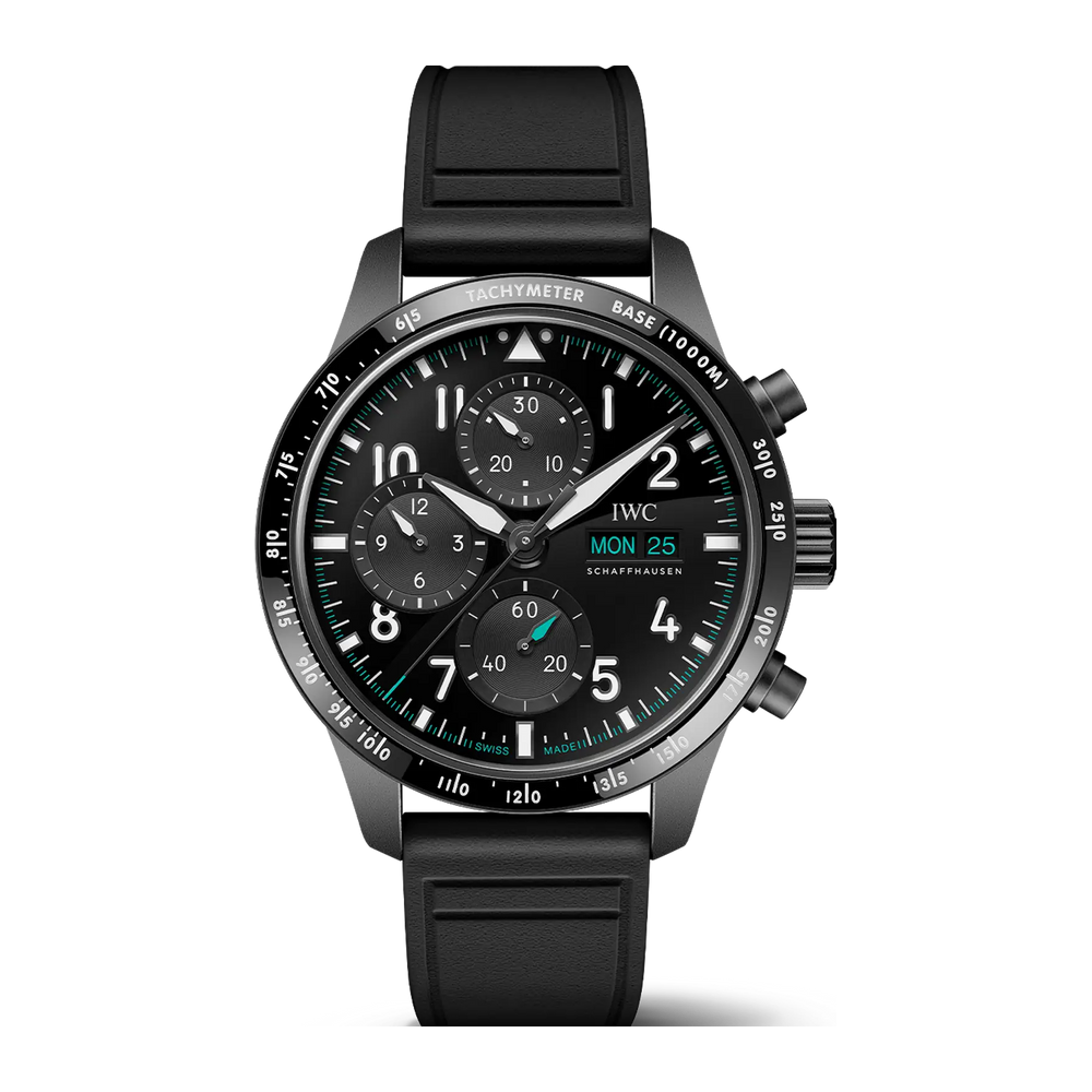 The Pilot’s Watch Performance Chronograph 41 Mercedes-AMG PETRONAS Formula One™ Team features a 41-millimetre Ceratanium® case, a black dial, nickel noir hands and appliques and a black rubber strap.
