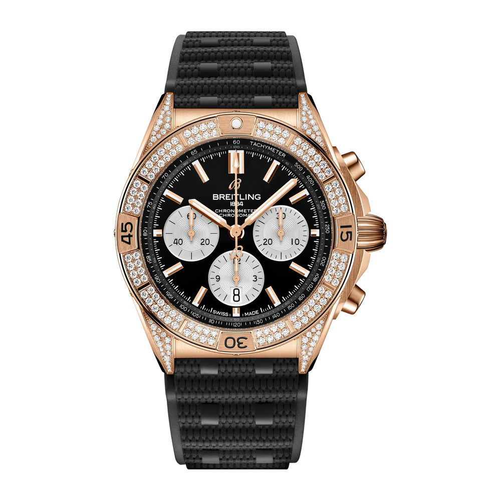 Available in a variety of materials from stainless steel to luxurious 18 k red gold, the Chronomat features a 42 mm case and the iconic bezel with the four rider tabs. Available in a range of colorful dials, the Chronomat is matched to the signature “Rouleaux” bracelet in metal or rubber and is powered by the in-house Breitling Manufacture Caliber 01, a COSC-certified chronometer.